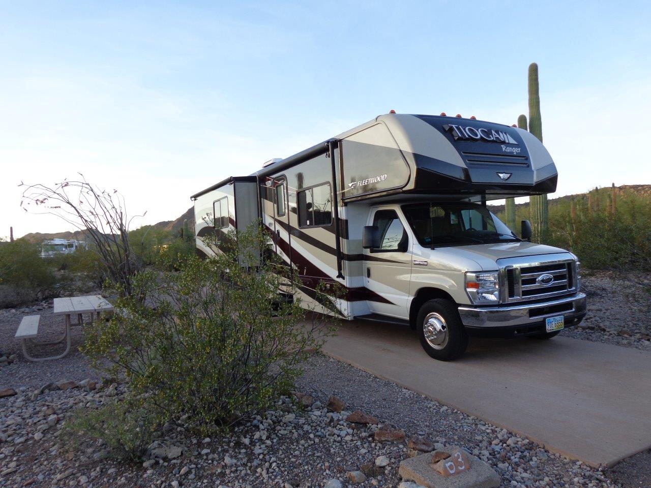 Nice paved campsites and lots of space and desert plants between RVs. Just wish they had electric power so I could run my AC. Temperature today was 84 and supposed to get to 88 tomorrow! One problem with this campground is that it is only about four miles to the Mexican border, so there are lots of signs warning you to report suspicious activity.