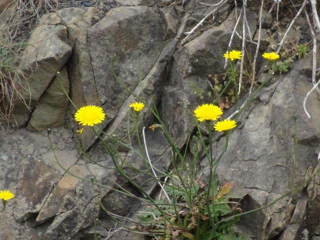 While I was stopped at one ocean pullover, I noticed some wild flowers growing on the cut bank of the mountain. These are succulents of some sort. At first, I thought the yellow flowers were growing next to the whitish succulents, but now I am convinced they were the same plant.