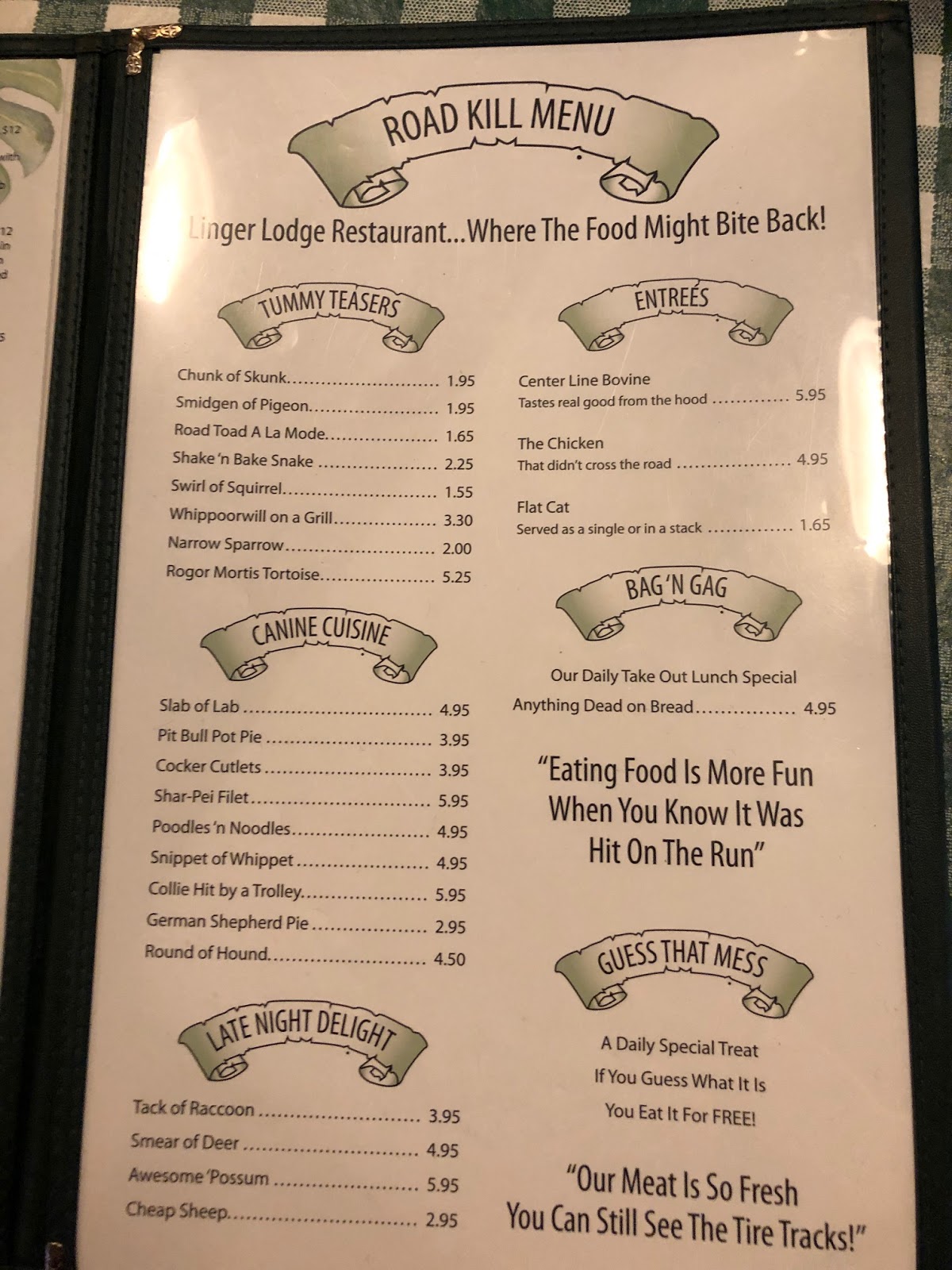 The menu tends to be fish, burgers, and ribs, with a little gator thrown in. Here is an image of the center of the menu.